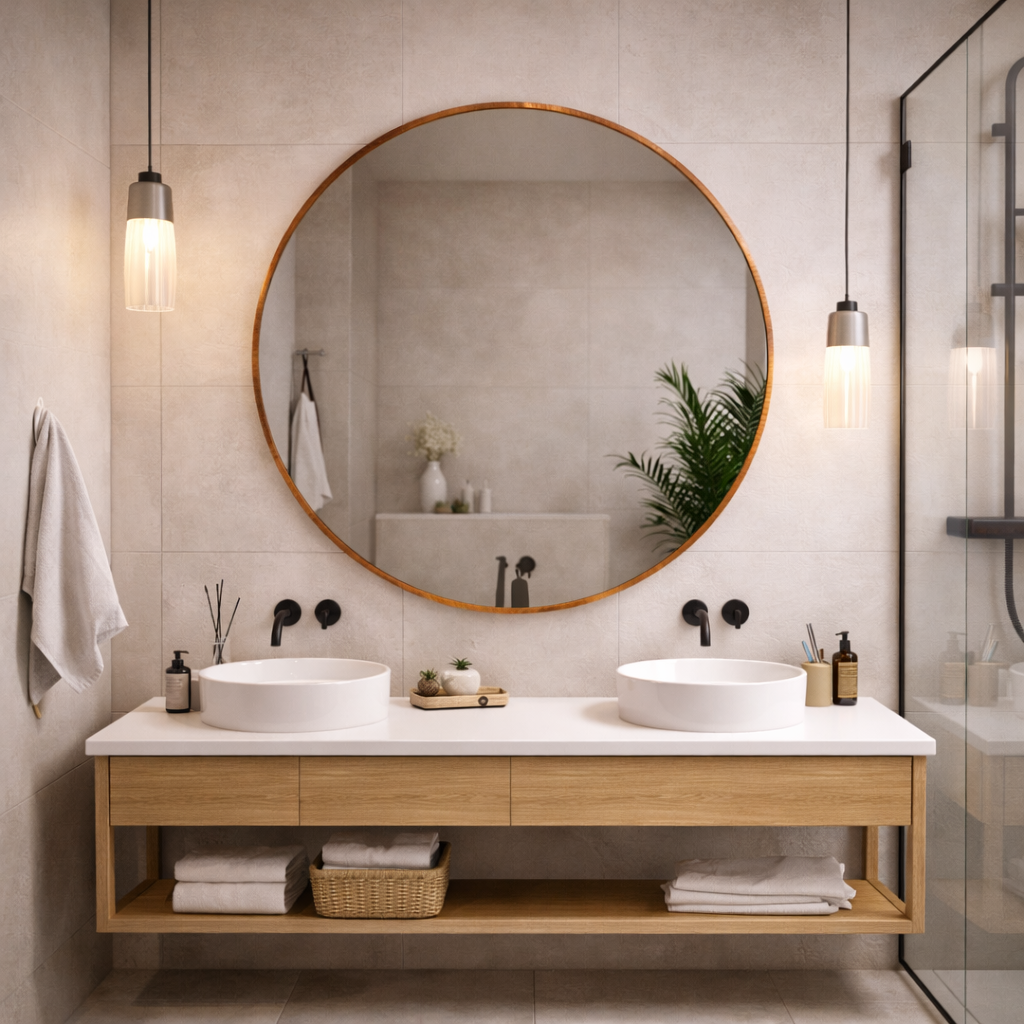 Obramowanie lustra jest delikatne, wąskie na 6 mm, podkreślające wyszukany, nowoczesny kształt.