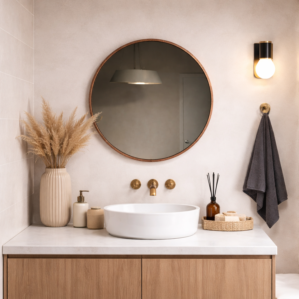 Obramowanie lustra jest delikatne, wąskie na 6 mm, podkreślające wyszukany, nowoczesny kształt.