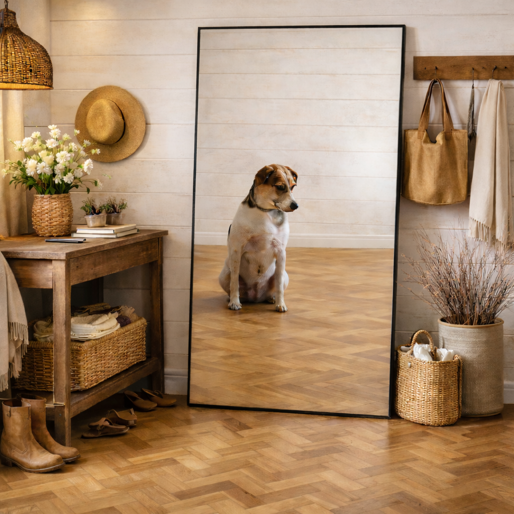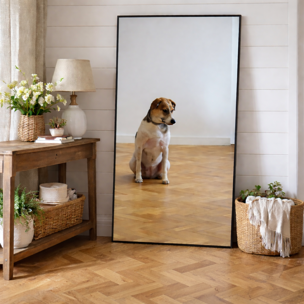 Lustro ma zamocowane 2 wieszaki do powieszenia w orientacji pionowej.