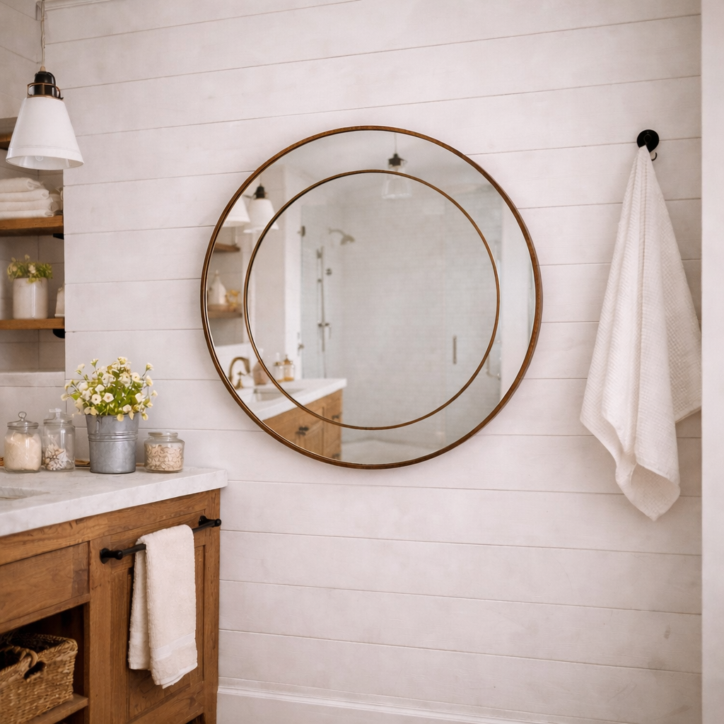 Ręcznie lutowane lustro w miedzianej patynie w kształcie koła, do salonu, przedpokoju lub sypialni.